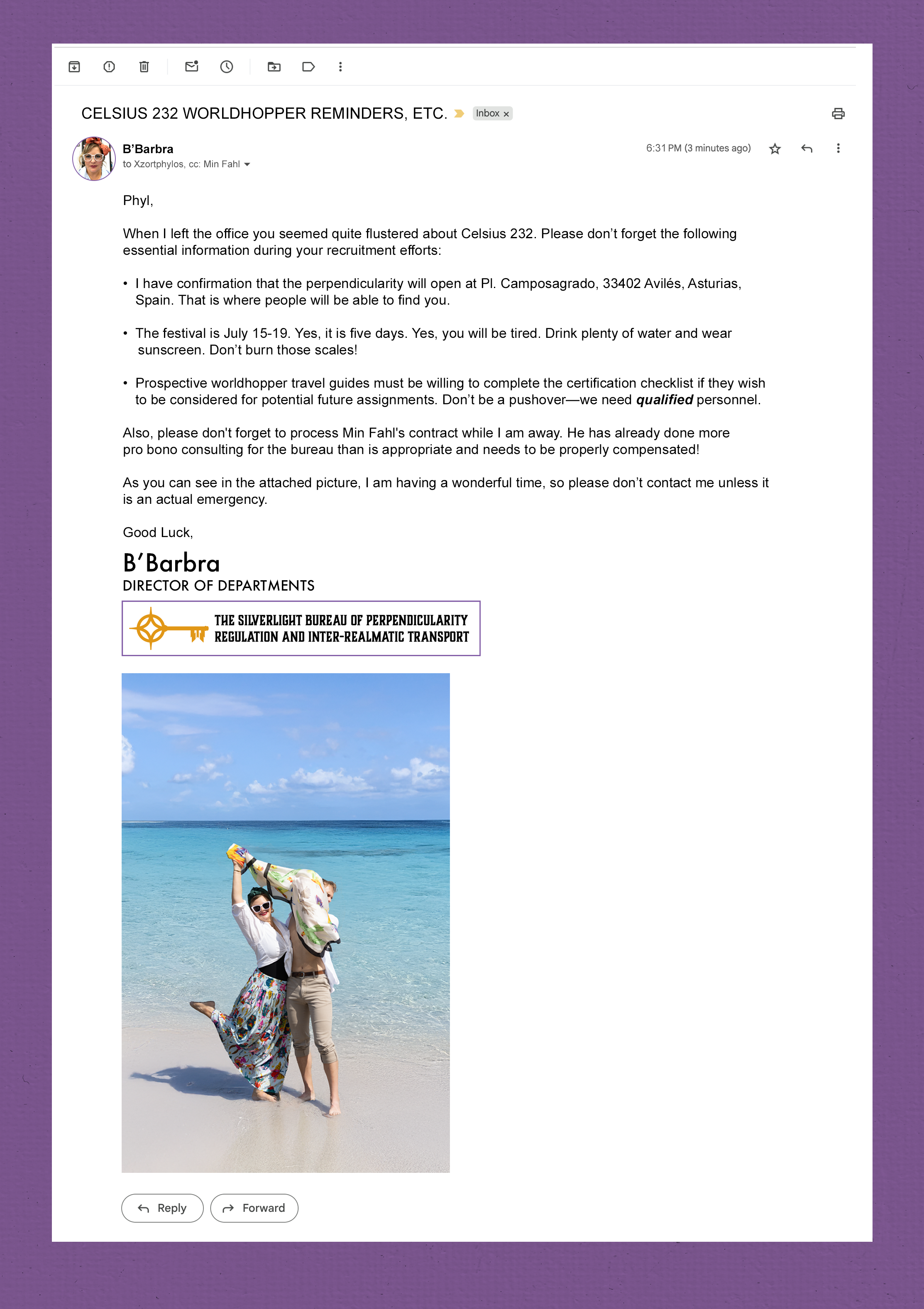 Following her exemplary fieldwork at C2E2, BβBarb has finally departed for her long-overdue vacation to the Purelake, where she intends to commune with a local strain of spa spren and practice the ancient art of floating in silence. We wish her warm shallows and minimal philosophical entanglements.